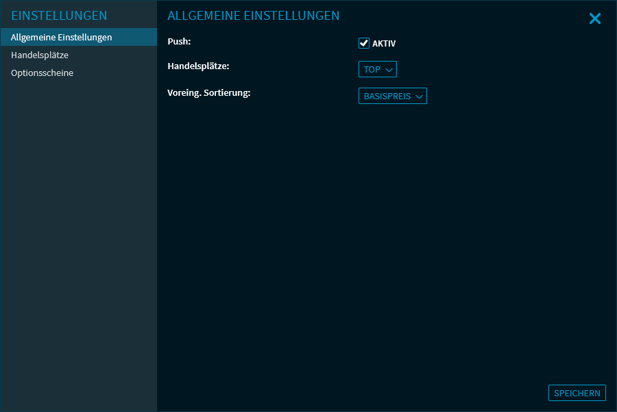 - Über die Auswahlliste "Voreing. Sortierung" die voreingestellte Sortierung für die Liste der Optionsscheine festlegen (Standardmäßig werden diese nach der Spalte "Basispreis" sortiert, alternativ können Sie auch nach der Spalte "Fälligkeit" sortieren)