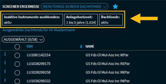Beispiel: Widget "Screener Ergebnisse" mit eingeblendeten Filtern