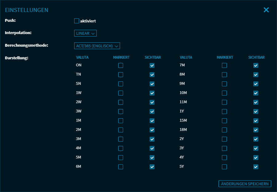 | Darstellung | Legen Sie hier fest, welche Valutazeiträume angezeigt werden sollen. Aktivieren bzw. deaktivieren Sie dazu die entsprechenden Kontrollkästchen der Spalte "Sichtbar". Über die Kontrollkästchen in der Spalte "Markiert" können Sie darüber hinaus festlegen, welche der angezeigten Werte farblich hervorgehoben werden sollen. |