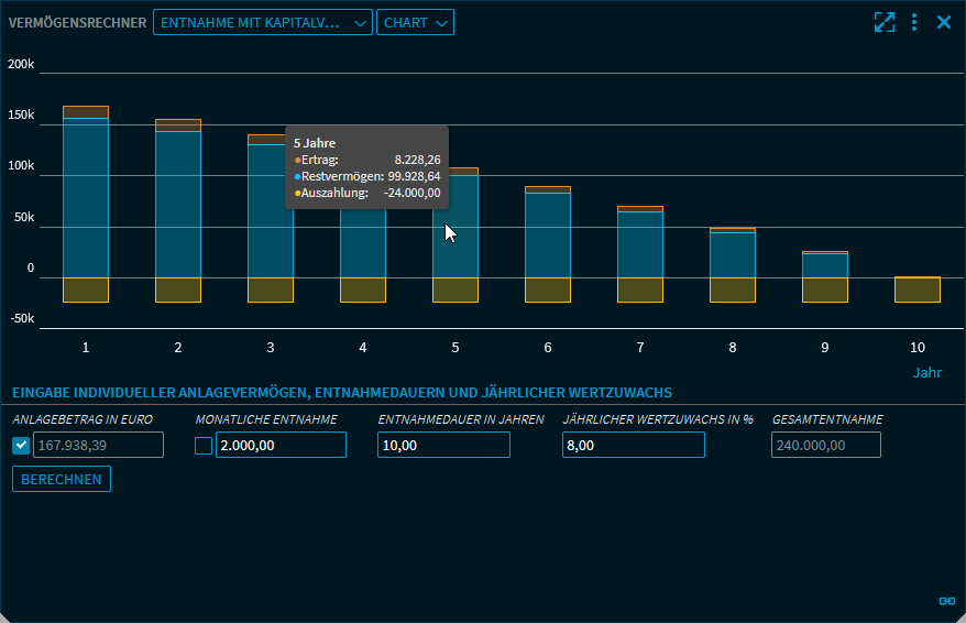 Im Diagramm oder in der Tabelle sehen Sie dann für jedes Jahr Ertrag, Auszahlung und Restvermögen.