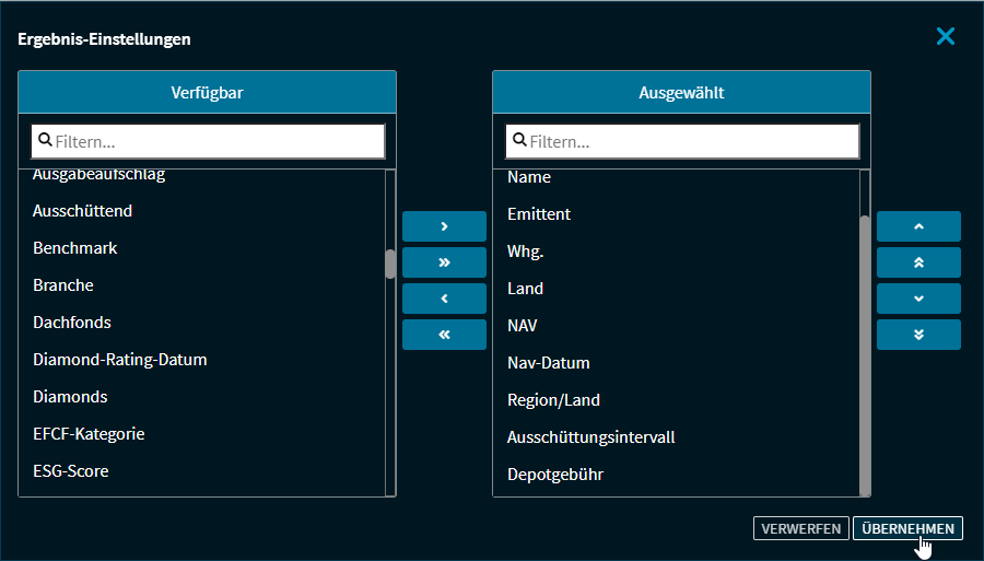 Auf der linken Seite finden Sie alle für den Screen verfügbaren Spalten, auf der rechten Seite die aktuell für die Anzeige in der Ergebnisliste ausgewählten Spalten. Über die oberen Filterfelder können Sie nach Spalten suchen, über die mittleren Buttons markierte Spalten ein- oder ausblenden und über die Buttons auf der rechten Seite die Reihenfolge der markierten Spalten der Ergebnisliste ändern. Sie speichern Ihre Einstellungen in diesem Dialogfenster mit dem Button "Übernehmen". |