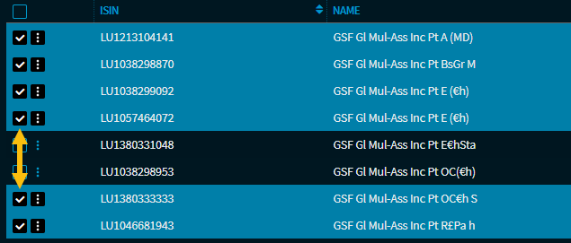 | Spalte "Zeilenauswahl" | In der ersten Spalte können Sie die einzelnen Zeilen bzw. Wertpapiere auswählen. Über das Kontrollkästchen in der Spaltenüberschrift wählen Sie alle Wertpapiere aus. |