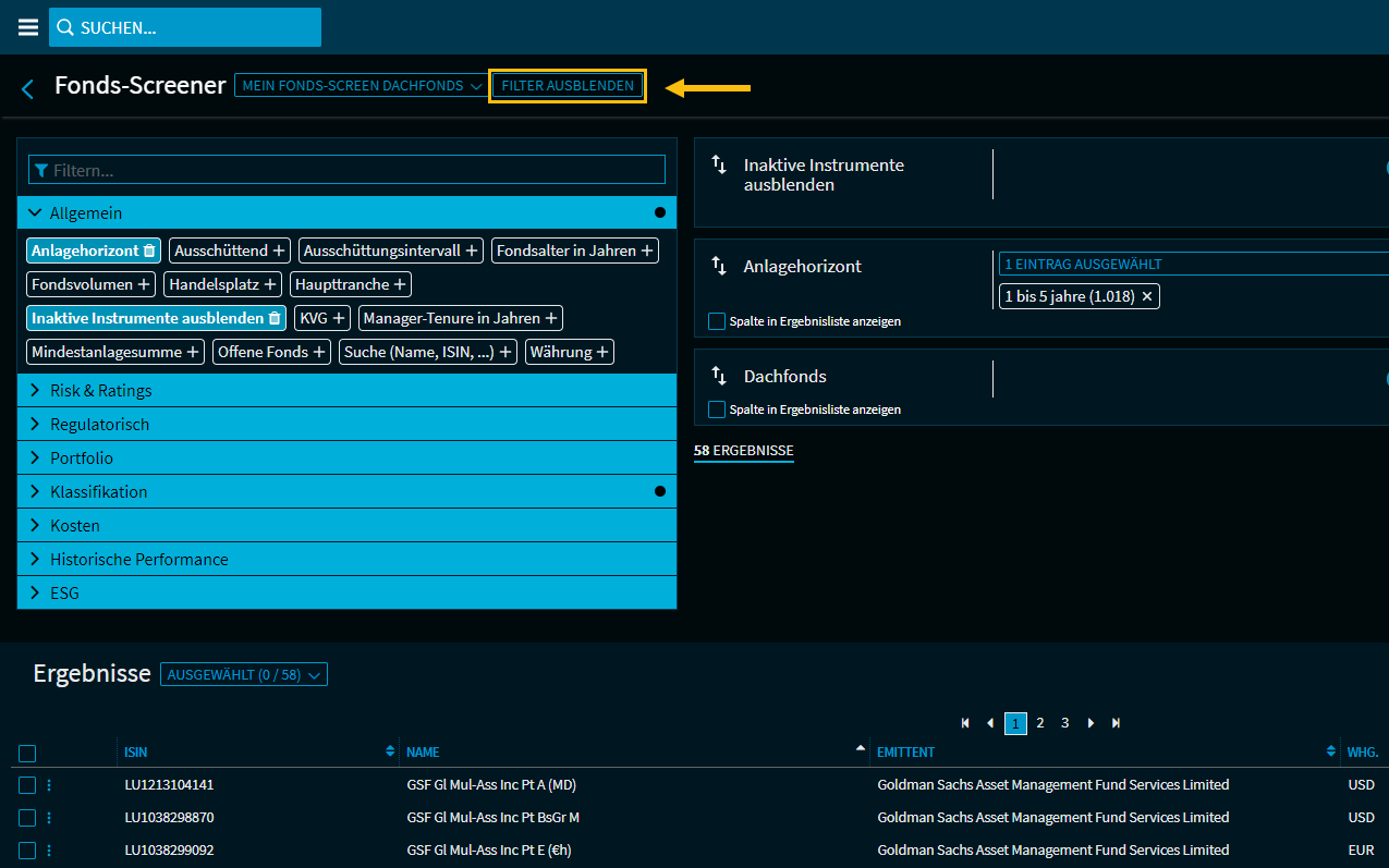 Die Ergebnislisten werden unten im Screener angezeigt und können über den Button "Filter ausblenden" maximiert werden.