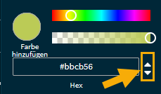 - Eingabe des Hexadezimal-Codes, der RGB- oder HSLA-Werte; die Auswahl erfolgt über die Pfeile rechts neben dem Eingabefeld: