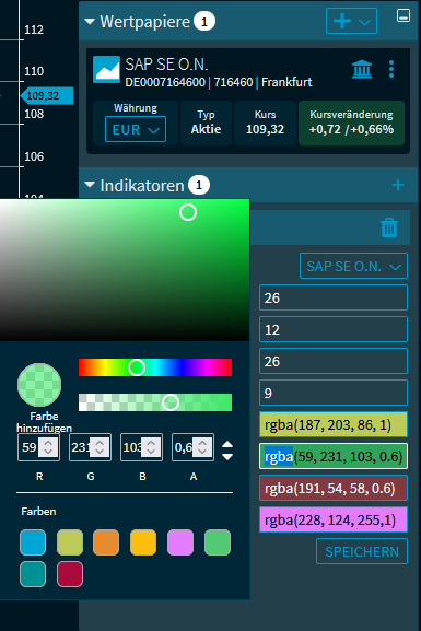 Haben Sie wie im Abschnitt Indikatoren einblenden beschrieben technische Indikatoren im Widget "Chart-Analyse" eingeblendet, so können Sie deren Chartlinienfarbe individuell auswählen. Gehen Sie dazu wie folgt vor: