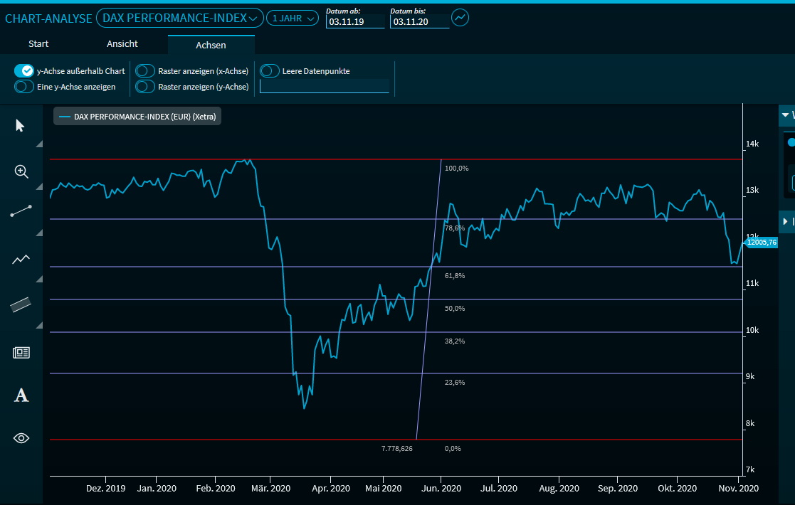 Die horizontalen Fibonacci-Linien werden bei 0% - 23,6% - 38,2% - 50% - 61,8% - 78,6% - 100% - 123,6% - 138,2%... gezeichnet.
