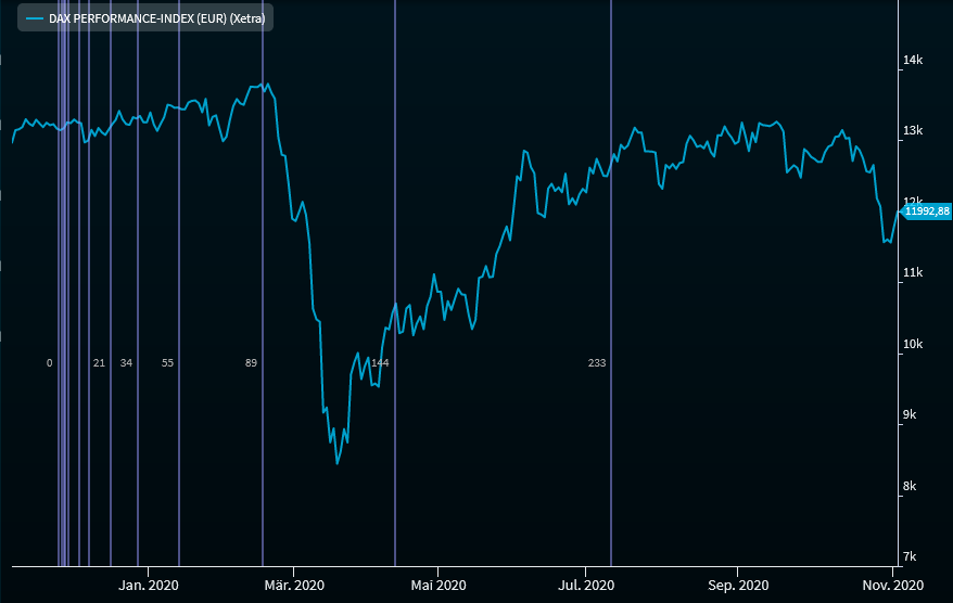 Fibonacci-Zeitzonen sind eine Anzahl vertikaler Linien. Sie werden in den Chart eingezeichnet, indem Sie mit der Maus auf den Startpunkt für die erste Zeitzone klicken. Die Zeitzonen werden eingezeichnet und haben die Abstände der Fibonacci-Intervalle von 1, 2, 3, 5, 8, 13, 21, 34, 55, 89, 144, 233. Nach der Fibonacci-Interpretation sucht man nach beträchtlichen Kursänderungen in der Nähe der Linien.