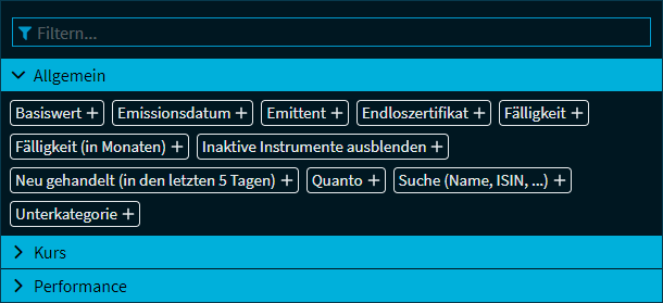 Filter in Zertifikate-Screens (Wertpapier-Gruppe "Alle")