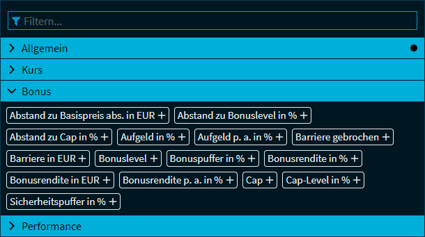Zusätzlich zu den im Abschnitt Filter in Zertifikate-Screens (Wertpapier-Gruppe "Alle") beschriebenen Filtern stehen Ihnen für Bonus-Zertifikate noch die folgenden Filter zur Verfügung: