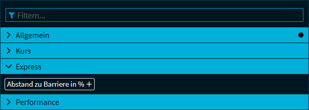 Zusätzlich zu den im Abschnitt Filter in Zertifikate-Screens (Wertpapier-Gruppe "Alle") beschriebenen Filtern steht Ihnen für Express-Zertifikate noch der folgende Filter zur Verfügung: