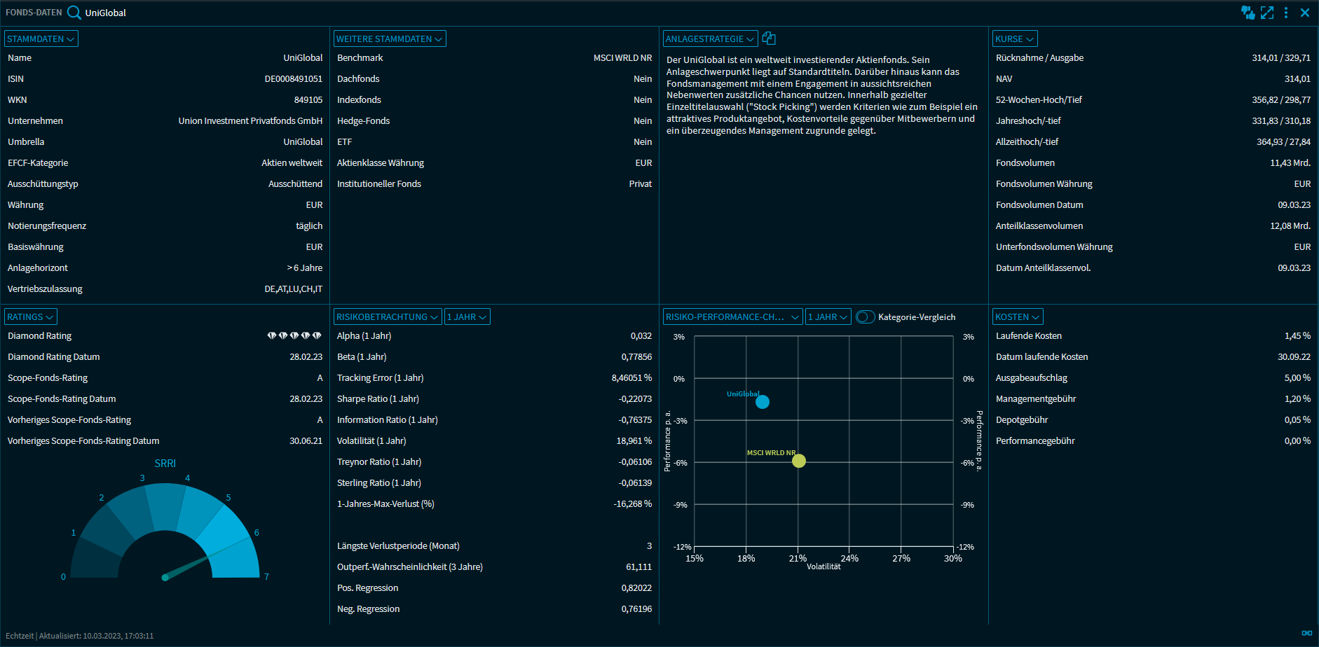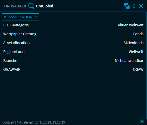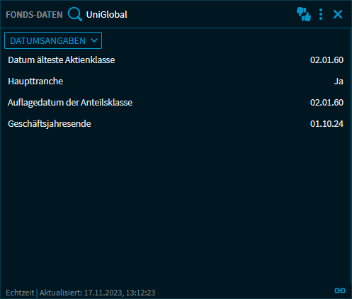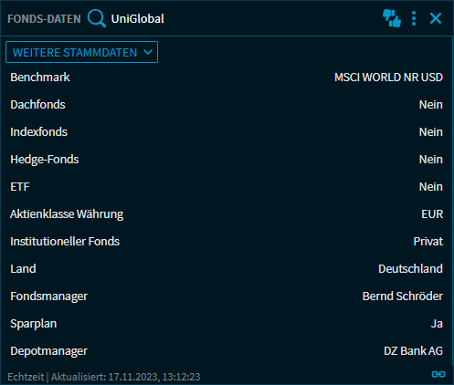 Bei entsprechender Freischaltung steht Ihnen das Widget "Fonds-Daten" mit folgenden Ansichten zur Analyse von Fonds zur Verfügung: