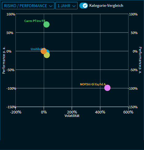Ziehen Sie den Schalter "Kategorie-Vergleich" nach rechts, um die Fonds mit den höchsten und niedrigsten Volatilitäts- und Performancewerten der Kategorie einzublenden: