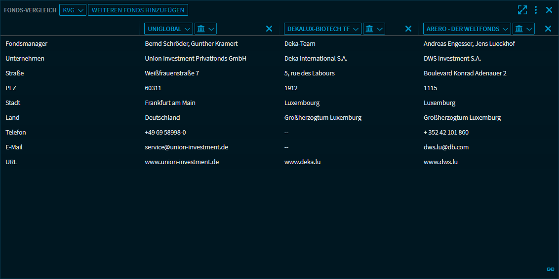 In der Ansicht "KVG" finden Sie die Informationen bezüglich der Kapitalverwaltungsgesellschaften der Fonds: