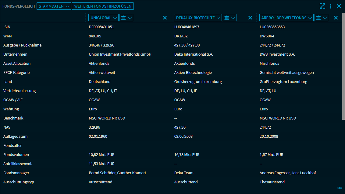In der Ansicht "Stammdaten" vergleichen Sie die Fonds nach folgenden Kriterien: