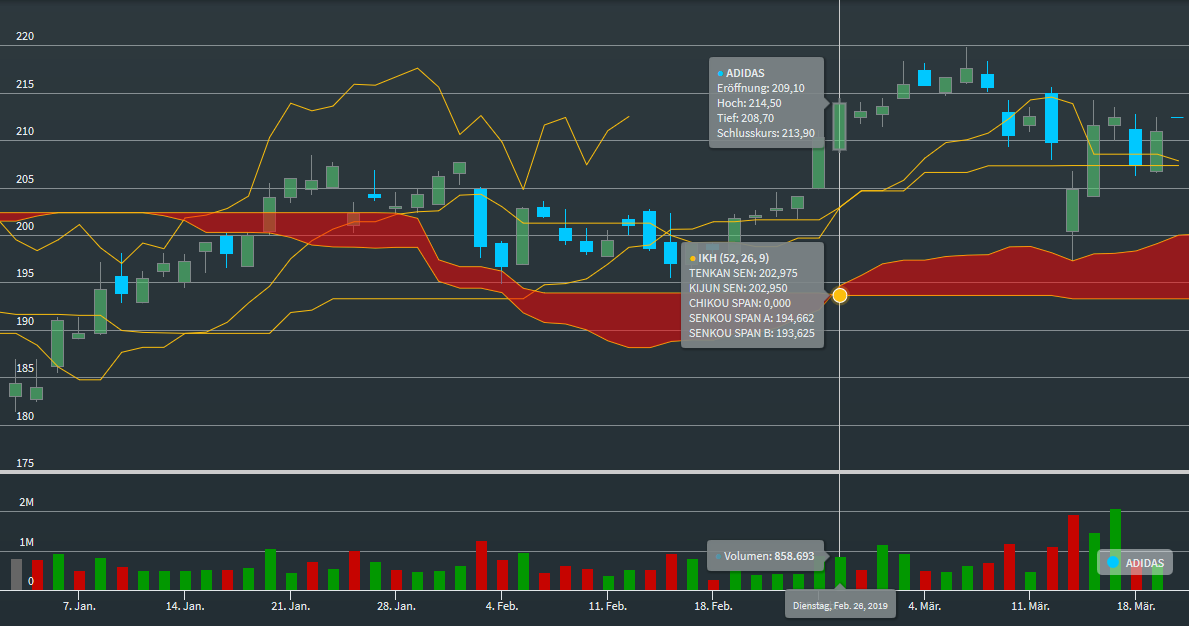Der Ichimoku Kinko Hyo (IKH) ist ein in Japan entwickelter Indikator. Der IKH, oft auch "Ichimoku" genannt, ist eine Methode der technischen Analyse, die auf Candlestick-Charts aufbaut und die Zielgenauigkeit der Prognose von Kursbewegungen verbessern soll.
