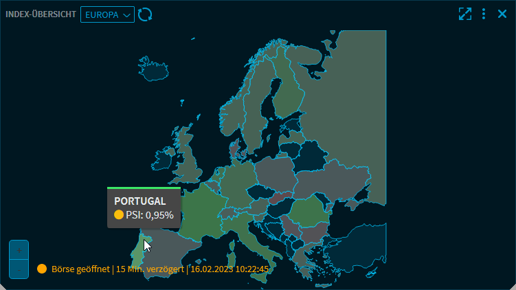 Schon an der Farbe des Landes (hier: grün) sehen Sie, wie sich der Leitindex des Landes (hier: PSI 20) aktuell im Vergleich zum Vortag entwickelt. Nutzen Sie die Plus- und Minus-Buttons links unten, um die Ansicht zu vergrößern ("Zoom in") oder zu verkleinern ("Zoom out"). Zeigen Sie mit der Maus auf Portugal, so wird Ihnen der Index und dessen aktuelle prozentuale Entwicklung (hier +0,88%) angezeigt. Ist die Börse wie im Beispiel geöffnet, so erkennen Sie dies am gelben Punkt (geschlossen: weiß) vor dem Indexnamen sowie am eingeblendeten Text unten im Widget, dem Sie auch den Zeitstempel der aktuellen Darstellung entnehmen. Hier finden Sie auch die Information, ob die Indexveränderung in Echtzeit oder verzögert angezeigt wird.