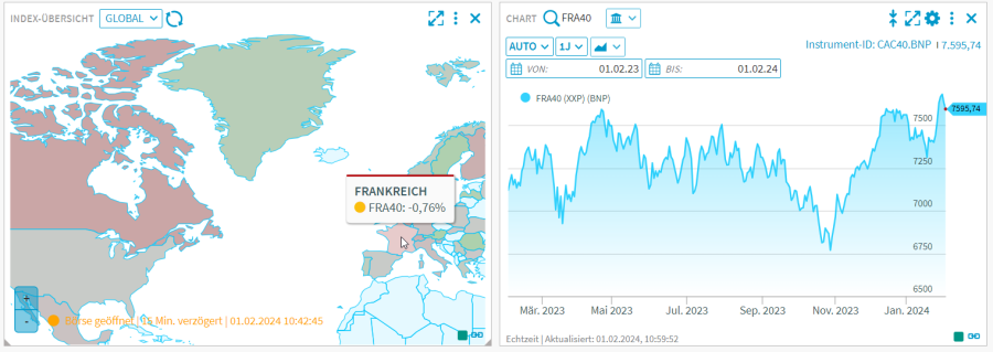 Das Widget "Index-Übersicht" unterstützt auch die Gruppierung von Widgets. Somit kann zum Beispiel bei Klick auf ein Land der entsprechende Chart zum Index angezeigt werden.