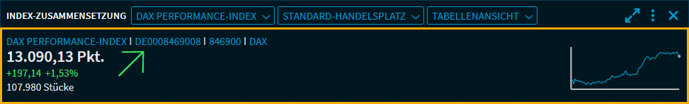 Im Widget "Index-Zusammensetzung" werden für einen (Aktien-)Index als Eingabeobjekt (z. B. DAX oder Hang Seng) alle Indexmitglieder in Tabellen- oder Kachelansicht aufgelistet.