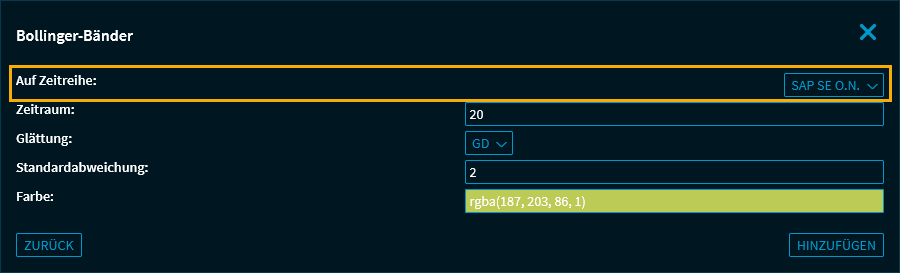- Haben Sie mehrere Wertpapiere (Zeitreihen) im Chart eingeblendet, so wählen Sie als nächsten Schritt oben im erscheinenden Dialogfenster die Zeitreihe aus, auf die der Indikator angewendet werden soll.