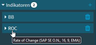 Hinter dem Menüeintrag "Indikatoren" erkennen Sie an der Zahl, wie viele Indikatoren aktuell eingeblendet sind. Die Indikatoren werden im aufgeklappten Indikatoren-Menü mit ihren Abkürzungen aufgelistet. Zeigen Sie auf die Abkürzung, um den Namen mit gesetzten Parametern anzuzeigen:
