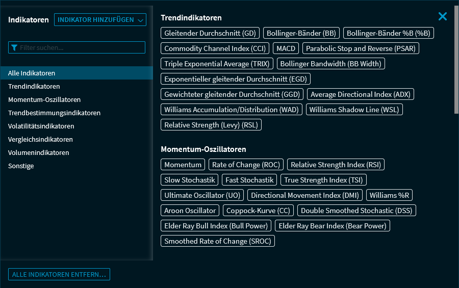 Im Widget "Chart-Analyse" können Sie viele verschiedene technischen Indikatoren einblenden.