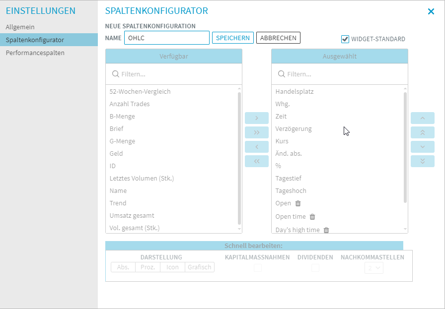 In den Widgets "Arbitrage", "Index-Zusammensetzung" und "Index-Zugehörigkeit" besteht nun die Möglichkeit, Spaltenkonfigurationen individuell abzuspeichern sowie eine bestimmte Konfiguration als Standard beim Neuanlegen dieser Widgets festzulegen.