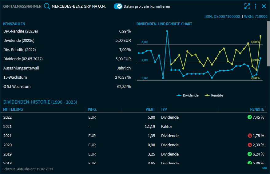 In diesem Widget werden alle Kapitalmaßnahmen eines Wertpapiers angezeigt. Das Widget enthält die wichtigsten Dividendenkennzahlen, eine Historie und einen Chart der Dividendenentwicklung. Oben im Widget wählen Sie das gewünschte Wertpapier aus. Neben Aktien können auch Fonds und ETFs sowie entsprechende Zertifikate ausgewählt werden.
