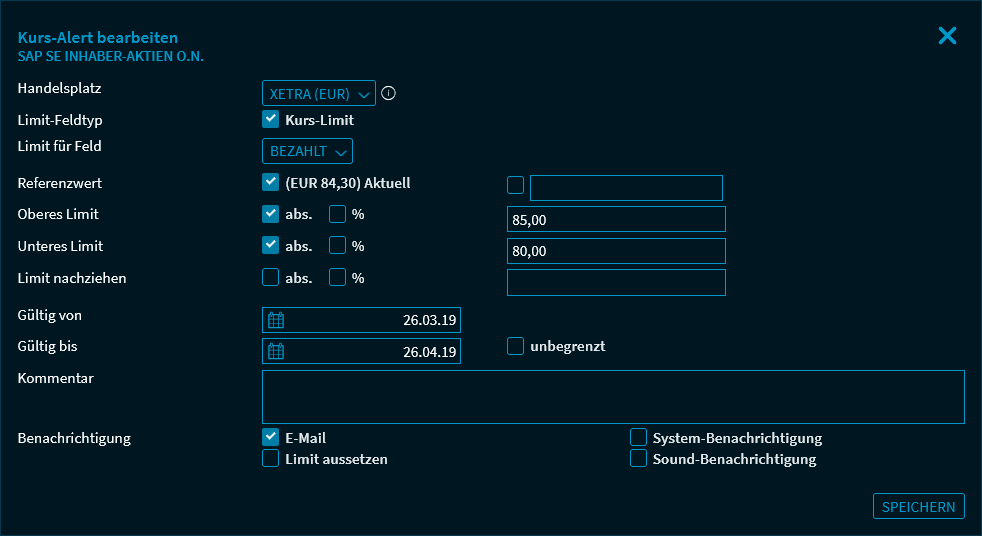 Die Felder entsprechen denen beim Einrichten der Kurs-Alerts. Lesen Sie zu Details ggf. den Abschnitt Kurs-Alerts einrichten.