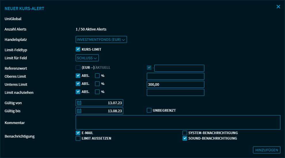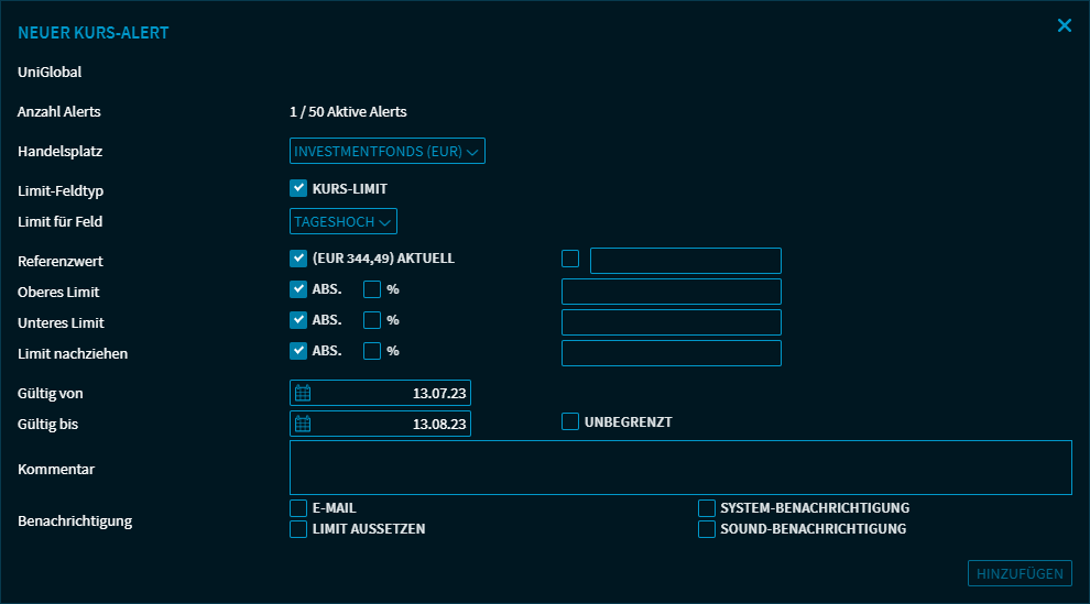 Oben im Dialogfenster sehen Sie den Namen des Wertpapiers sowie die aktuelle Anzahl aktiver Alerts.Darunter können Sie im Einzelnen folgende Daten eingeben: