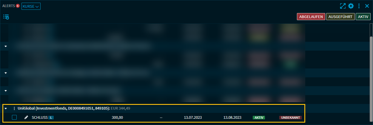 Der eingerichtete Alert erscheint im Widget in der Liste der Kurs-Alerts: