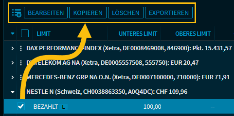 Über die Funktion "Kopieren" legen Sie schnell neue Kurs-Alerts an, die Sie dann bearbeiten können. Der Button "Kopieren" erscheint, wenn Sie einen Kurs-Alert der Liste ausgewählt haben.