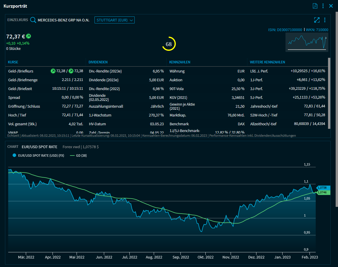 Je nach Wertpapiertyp und konfigurierter Overlay-Vorlage sehen Sie dann Kurse, Merkmale und Kennzahlen zum Wertpapier in den Widgets des Kurzporträts. In diesen Widgets finden Sie die aus den "normalen" Dashboards bekannten Funktionen.