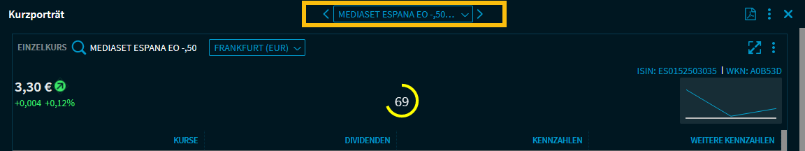 Haben Sie mehrere Wertpapiere ausgewählt, z. B. in einer Ergebnisliste im Screener, so können Sie über die dann sichtbare Auswahlliste oben im Kurzporträt das aktuell angezeigte Wertpapier durch ein anderes Wertpapier der Ergebnisliste im Kurzporträt ersetzen. Über die Pfeil-Icons navigieren Sie durch die Ergebnisliste.