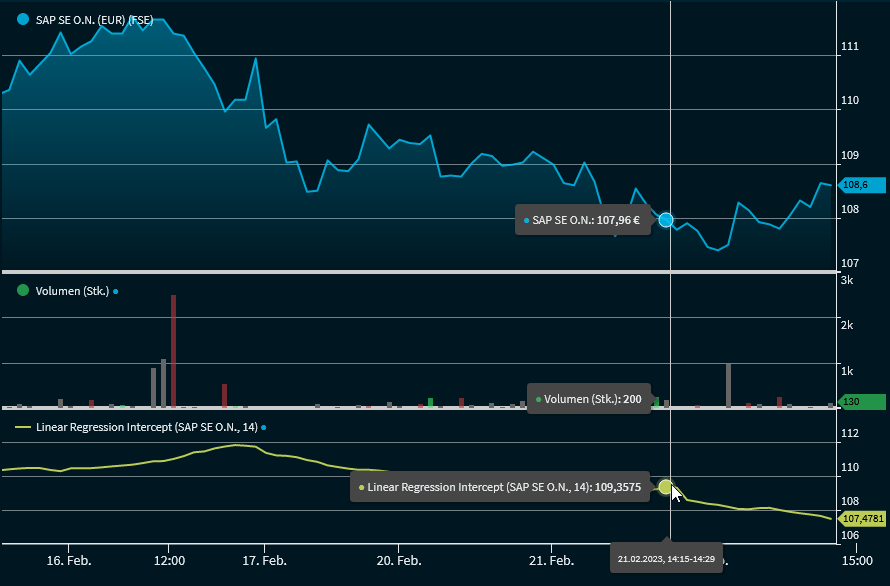 Der Linear Regression Intercept liefert den Wert der Regressionskonstante, d. h. aus mathematischer Sicht den jeweiligen Schnittpunkt der Regressionsgeraden mit der Kursachse. Mit den beiden Werten "Slope" und "Intercept" ist eine Gerade eindeutig festgelegt.
