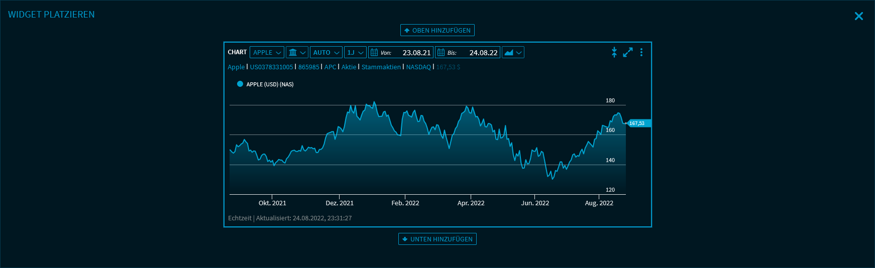 Für dieses Chart-Widget können Sie dann im erscheinenden Fenster "Widget platzieren" entscheiden, ob Sie das Widget oben im Dashboard (Button "Oben hinzufügen") oder am Ende des Dashboards (Button "Unten hinzufügen") platzieren möchten:
