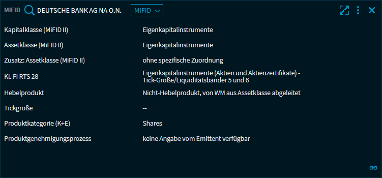 In diesem Widget werden alle relevanten Daten für MiFID II für ein Wertpapier angezeigt. Oben im Widget wählen Sie das Wertpapier und den gewünschten Bereich.
