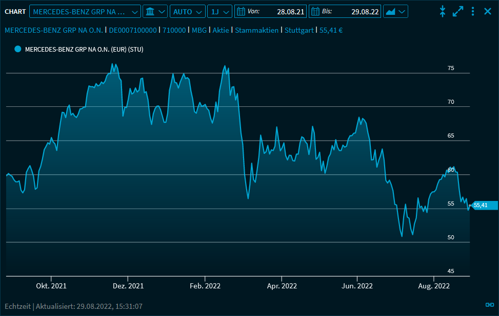 Im Widget "Chart" ist der Charttyp "Mountain" die Standardeinstellung. Hier wird die Chartlinie an jedem Tag, an dem ein Kurs zustande kommt, weitergezeichnet. Wochenenden und Feiertage bleiben dabei unberücksichtigt.