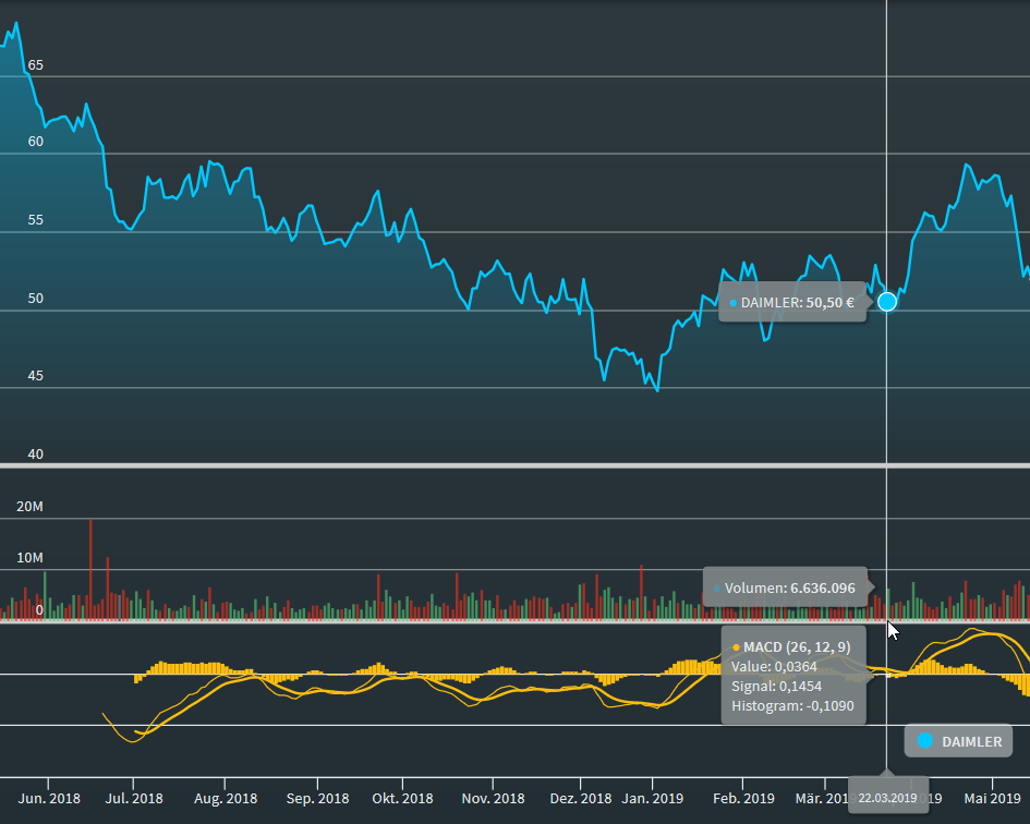 Eine etwas schwierigere Anwendung ist die Verwendung des MACD zur Untersuchung von Divergenzen mit dem Basiswert. Schwieriger deshalb, weil Sie in diesem Fall selbst Trendlinien einzeichnen müssen, um zu einem Ergebnis zu kommen. Ein Beispiel wäre das Herausbilden neuer Höchststände im Basiswert, während die Höchstwerte im MACD schon zurückgehen. In diesem Fall ist mit einer baldigen Trendumkehr, also dem Fallen des Basiswerts zu rechnen.
