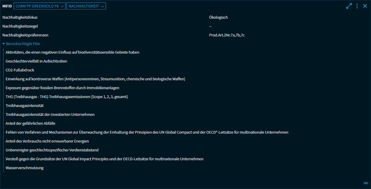 | Berücksichtigte PAIs | Hier finden Sie die Liste der berücksichtigten PAIs ("Principal Adverse Impacts" = "Nachteilige Auswirkungen auf Nachhaltigkeitsfaktoren"). Diese Liste klappen Sie über das Pfeilsymbol auf der linken Seite des Widgets auf und zu. |
