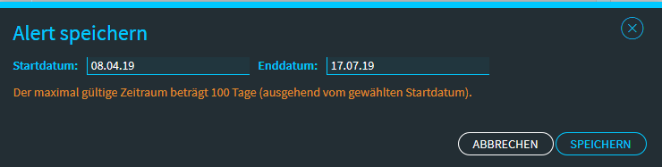 - Legen Sie im erscheinenden Dialogfenster "Alert speichern" mithilfe der in die Eingabefelder integrierten Kalender Start- und Enddatum für den Nachrichten-Alert fest. Der maximal mögliche Zeitraum beträgt 100 Tage (ausgehend vom gewählten Startdatum).