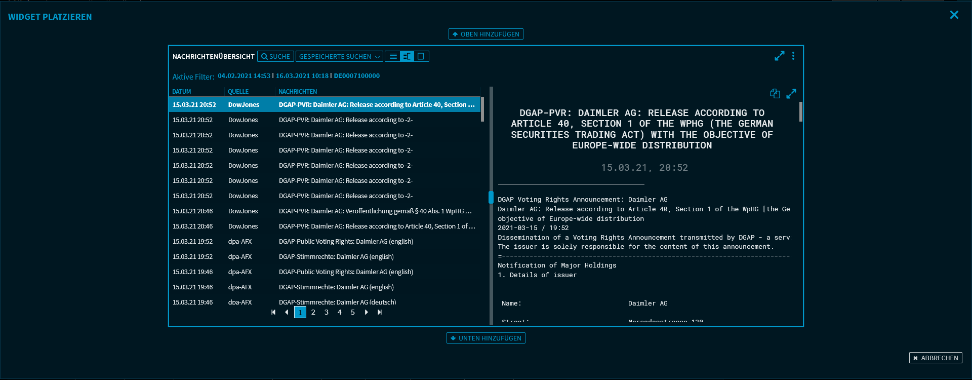 - Lassen Sie die Maustaste los, so wird direkt ein Widget "Nachrichtenübersicht" für das Wertpapier für diesen Zeitraum geöffnet - entscheiden Sie wie gewohnt, wo das Widget im Dashboard eingefügt werden soll.