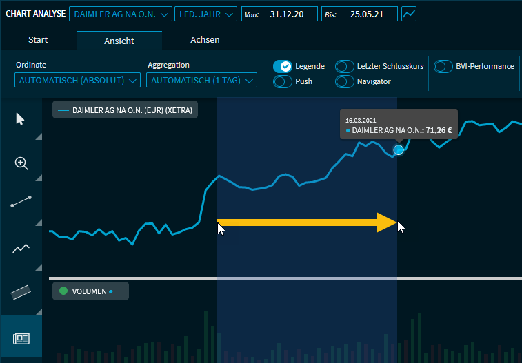 - Klicken Sie dann zum gewünschten Anfangsdatum in den Chart und ziehen Sie das Intervall bei gedrückter Maustaste bis zum gewünschten Enddatum.