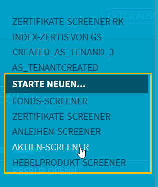 - Wählen Sie im Screener-Explorer im Bereich "Starte neuen..." den gewünschten Wertpapiertyp-Screener.