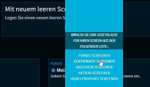 Befinden Sie sich in einem geöffneten Screen, dann gehen Sie wie folgt vor, um einen neuen Screen für einen Wertpapiertyp anzulegen (ohne auf die Screener-Startseite zurückzukehren):