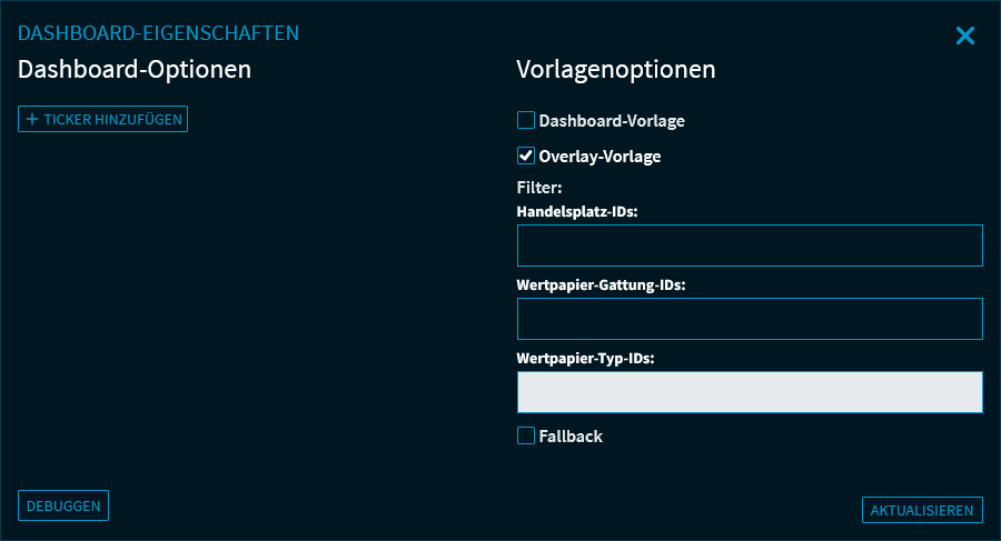 Passen Sie ggf. die Dashboard-Eigenschaften der Kurzporträt-Vorlage an. Anhand der Einstellungen wird beim Öffnen von Suchergebnissen (im Screener) die am besten passende Kurzporträt-Vorlage für ein Wertpapier ermittelt.