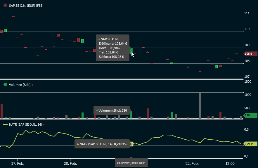 Der Normalised Average True Range misst die Volatilität. Wegen der Normalisierung eignet sich der NATR besser für einen Vergleich über verschiedene Kurslevels hinweg als der Average True Range.