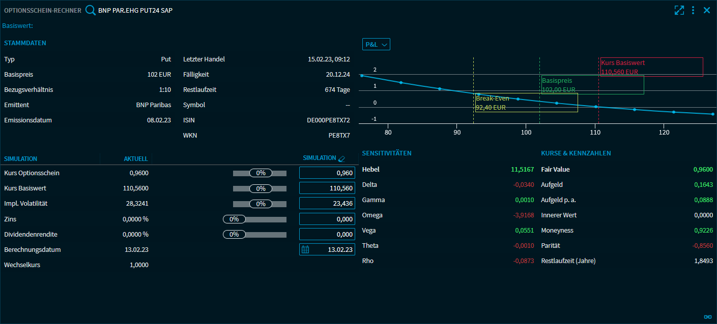 Mit dem Widget "Optionsschein-Rechner" können Sie ganz einfach und übersichtlich unterschiedliche Szenarien der Entwicklung eines Optionsscheins simulieren. Gleichzeitig bietet der Optionsschein-Rechner einen umfassenden Überblick über alle wichtigen Daten, Simulationsergebnisse und Kennzahlen.