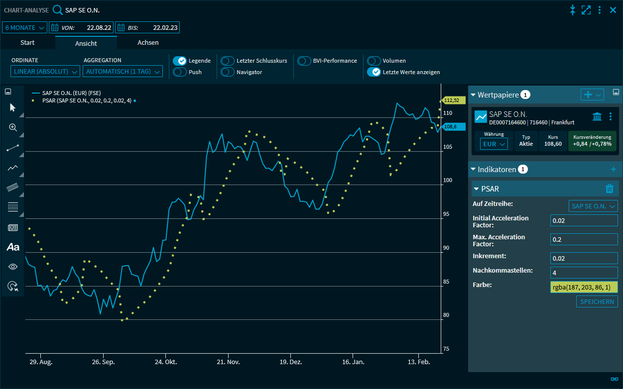 Welles Wilder entwickelte den Parabolic SAR (PSAR) um eine Stop-Marke herum. Neben der Stop-Marke werden die Preisentwicklung und die Zeit in den Indikator eingearbeitet.