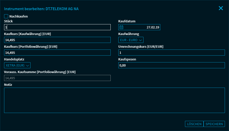 Wählen Sie diesen Button, um die Position aus dem Portfolio zu löschen. Vor dem endgültigen Löschen der Position erscheint noch eine Sicherheitsabfrage.