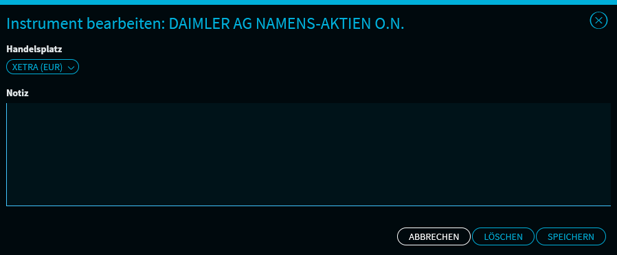 Ändern Sie dann im erscheinenden Dialogfenster "Instrument bearbeiten" die gewünschten Daten. Die Felder entsprechen denen beim Erfassen der Positionen. Lesen Sie zu Details ggf. den Abschnitt Wertpapier zu einer Kursliste hinzufügen.